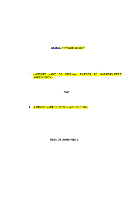 The Deed of Adherence is used in circumstances where a new party becomes a shareholder in a company, either by acquiring shares from an existing shareholder or by subscribing for new shares in the company, and there is already in place a Shareholders’ Agreement between the existing shareholders.